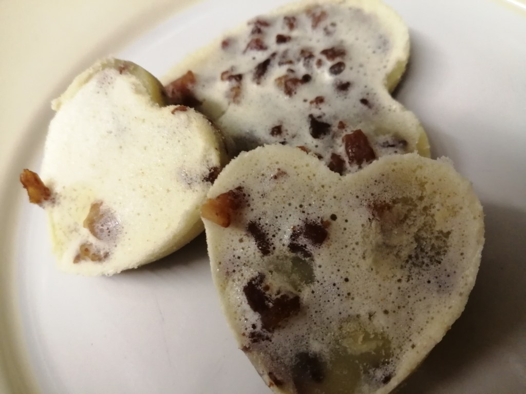 I cooked them for another ten minutes or so from taking this photo, and the bacon bits gave off a lot more bacon grease – yum! Once the bacon bits are cooked to your liking, remove the pan from the heat and carefully scoop out a few at a time with a slotted spoon. Fill your moulds evenly with the bacon bits and then carefully pour the remaining bacon grease from the pan into a pyrex jug and set aside.