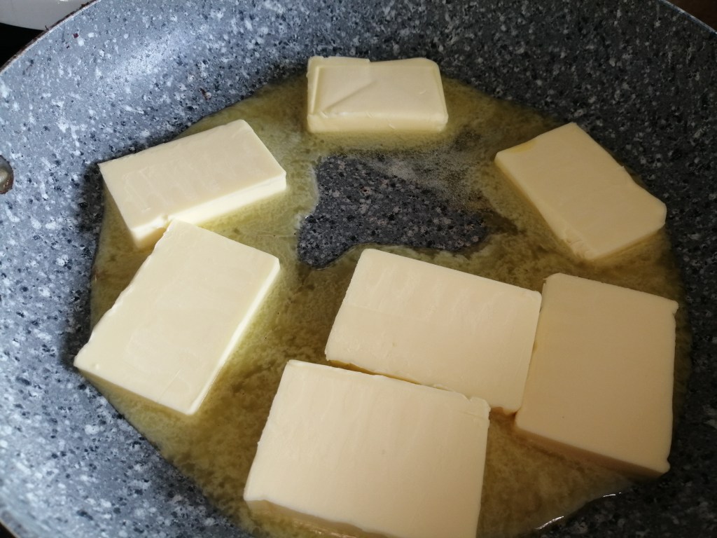Put the frying pan back on the stove on medium-low heat and melt the block of butter. I sliced the block up to help it melt quicker. Stir the butter with a wooden or heat-proof spatula until the butter turns to a rich golden amber colour and the white milk solids in the bottom of the pan turn to a dark brown colour.